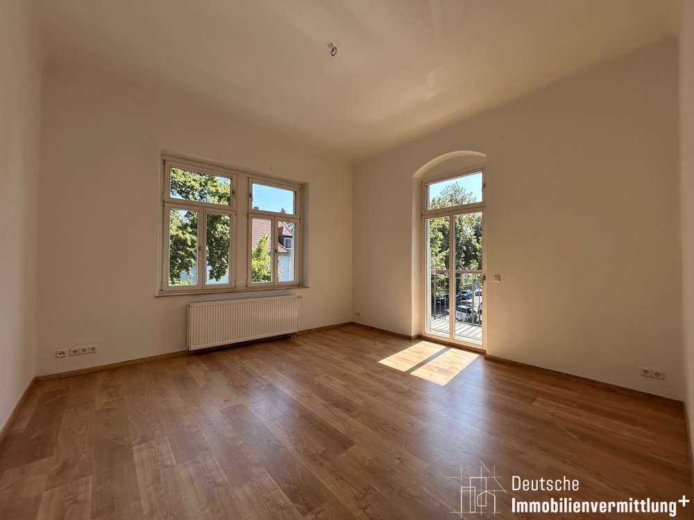 Großes helles Wohnzimmer mit Zugang zum Balkon, ebenfalls großzügiges Schlafzimmer, helles Tageslichtbad mit Wanne und geräumige Küche, welche Platz für einen Essbereich bietet. Alle Wohnräume sind mit Laminatboden ausgestattet.