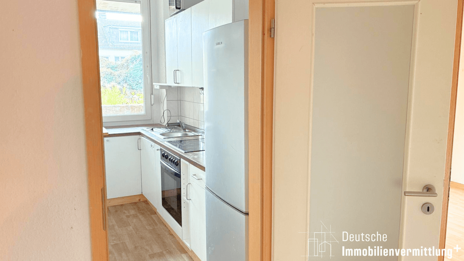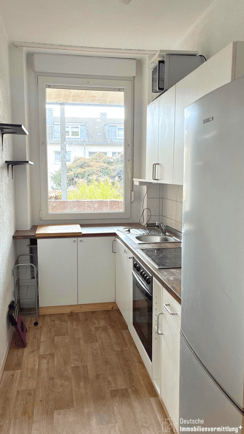 Folgen Sie dem Flur weiter, gelangen Sie links zur Küche, die mit einem Fenster und einer Einbauküche ausgestattet ist – perfekt, um direkt loszukochen. Am Ende des Flurs liegt das zweite, große Schlafzimmer, das durch seinen direkten Zugang zum Balkon begeistert. Von hier aus genießen Sie einen schönen Blick in den Garten und können sonnige Stunden im Freien verbringen.