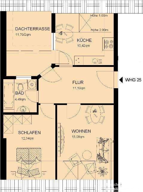 Edles Tageslichtbad mit partieller Fußbodentemperierung (elektrisch), Handtuchheizkörper und großem eingelassenem Spiegel. Wohn- und Schlafzimmer bieten ausreichend Stellfläche und sind mit Parkettboden versehen. Von der Küche aus gelangen Sie auf die Dachloggia.